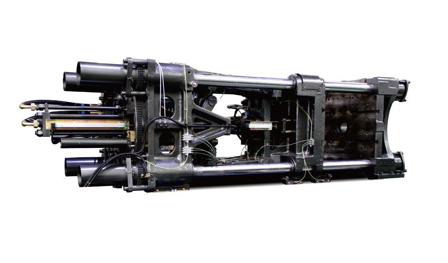 內(nèi)卷五支點曲肘式鎖模機構,經(jīng)有限元分析強化的鑄造連體結構的連桿及模板有效降低應力和變形量,提高鎖模部分的剛性和精度